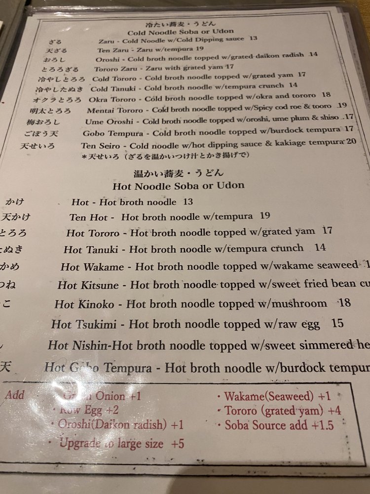 Cold broth noodle topped with oroshi, ume plum, and shiso.
